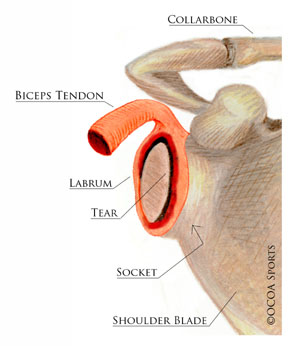 The shoulder is a ball and socket joint, similar to a golf ball on a tee. A rim of tissue called the labrum surrounds the socket like a bumper on a pool table.